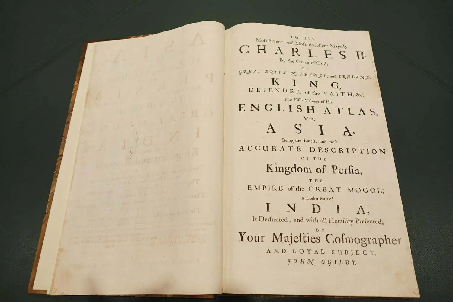 Der Autor widmete sein Buch König Charles II. - und das aus gutem Grund. Charles II. liebte Karten und Geographie, weshalb er John Ogilby, der 1670 einen Atlas von Afrika, Japan und Amerika veröffentlicht hatte, 1671 zum königlichen Kosmographen machte. 1674, ein Jahr nach der Publikation seines Werks über Asien, erhielt Ogilby sogar den Titel „His Majesty’s Cosmographer and Geographic Printer“.