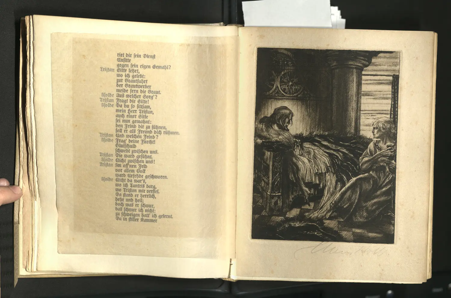 Aber schauen wir uns einmal die Bildsprache des uns vorliegenden Bands genauer an. Satz und Radierungen stammen von Alois Kolb, einem deutsch-österreichischen Maler, der ab 1907 Professor an der Königlichen Akademie für graphische Künste und Buchgewerbe in Leipzig war. Dort machte er die Radierabteilung zur Musterschule ihrer Art, die später viele bekannte Künstler hervorbrachte. (Leipzig verbindet ihn übrigens mit Wagner, der hier geboren ist.)