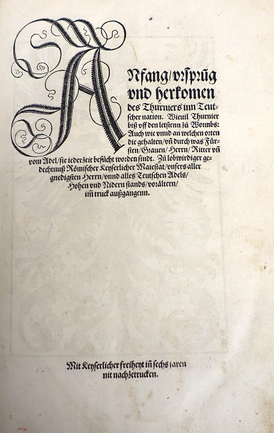 In diese Welt der schillernden Banner und strahlenden Rüstungen führt uns Rüxner mit seinem Turnierbuch. Es verzeichnet 36 Turniere, die zwischen 938 und 1487 stattgefunden haben sollen, mit allen Teilnehmern, nennt Sieger und Veranstalter und illustriert zentrale Momente mit Stichen. Rüxners Turnierbuch war nicht das einzige, aber besonders erfolgreich. Viele Ritter beriefen sich auf ihn als eine Art „Genealogischen Handbuchs des Adels“, wo die angeblichen Taten der erlauchten Vorfahren aufgelistet waren … Damals war die Ritterschaft bemüht, ihr Exklusivrecht an den Turnieren zu belegen. Das Turnierbuch half dabei, sich von den Ambitionen der städtischen Patrizier abzugrenzen. Heute gelten von den Turnieren allerdings die ersten 14 als völlig frei erfunden, die späteren als mit Vorsicht zu genießen.
