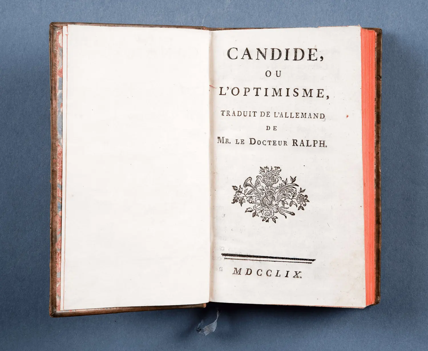 1759, vier Jahre nach dem Erdbeben von Lissabon, erschienen in mehreren Orten Europas gleichzeitig siebzehn Drucke gleichen Inhalts in französischer und englischer Sprache. Die französische Ausgabe trug den Titel „Candide ou l’Optimisme“, und gab vor, von einem Docteur Ralph aus dem Deutschen übersetzt worden zu sein.