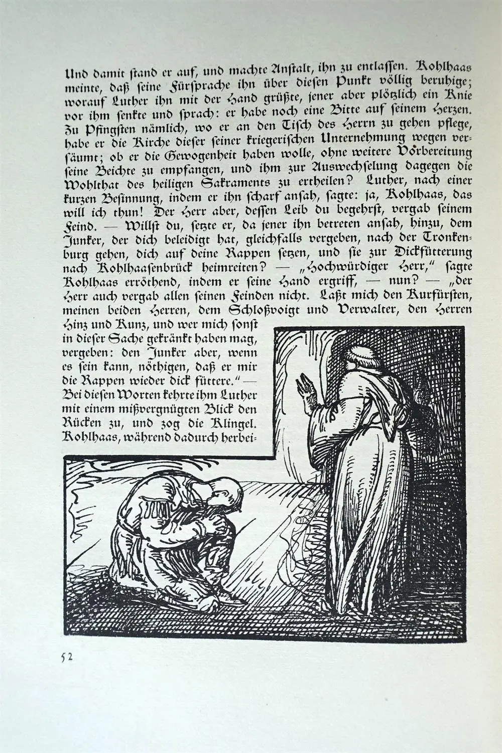 Illustriert hat das Buch der deutsche Künstler Bruno Goldschmitt. Er stimmte seine Bilder genau auf die gerade erzählten Szenen ab und bettete sie auch graphisch in den Text ein. Hier sehen wir das Treffen zwischen Michael Kohlhaas und Martin Luther. Kohlhaas hofft, dass ihm Luther in seinem Gerechtigkeitsempfinden zustimmt. Er handelt gemäß dem Leitspruch „Fiat iustitia et pereat mundus“ (dt.: „Es soll Gerechtigkeit geschehen, und gehe auch die Welt daran zugrunde!“). Luther aber hält dagegen und sagt, ein Unrecht könne niemals durch ein anderes Unrecht wieder gut gemacht werden. Man solle auf die private Rache verzichten und auf die Gerechtigkeit Gottes vertrauen.