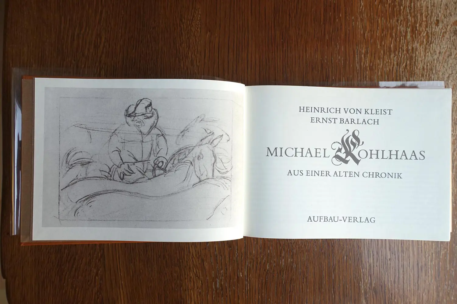 Schon 1910 bat man Barlach, eine neue Kohlhaas Ausgabe zu illustrieren. Er fertigte daraufhin über 50 Kohlezeichnungen in einem Skizzenbuch an, das Projekt wurde aber nie beendet. Das sieht man den Zeichnungen an. Sie sind oft unfertig, unvollkommen. Gerade das verleiht ihnen aber einen besonderen Charakter. Erst 1980 nahm man das Projekt wieder auf und publizierte die vorliegende Ausgabe.
