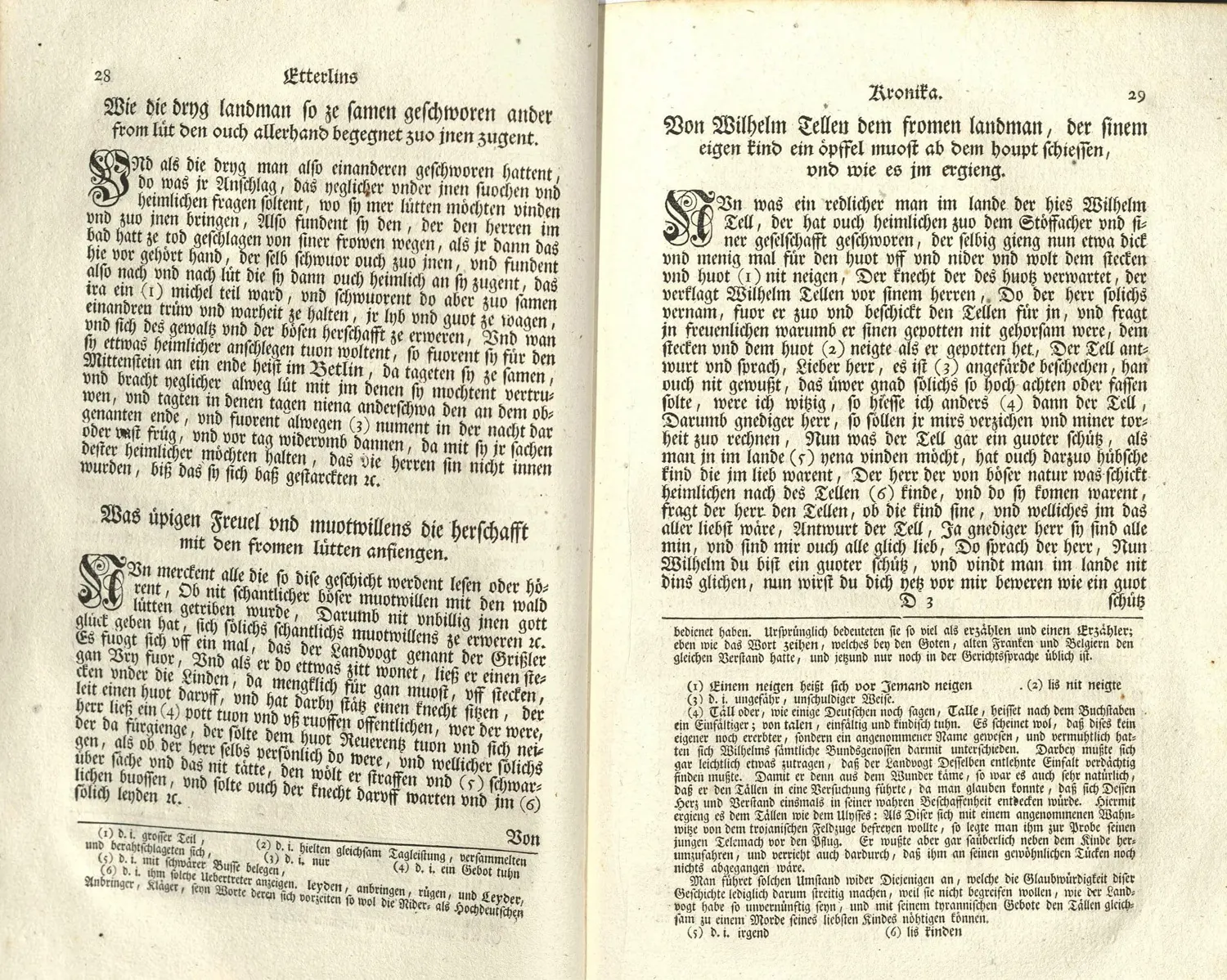 Spreng versuchte dem Leser das Verständnis des Textes durch Anmerkungen zu erleichtern und erklärte ihm auf S. 29, warum die Geschichte um Wilhelm Tell glaubwürdig ist.